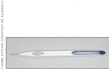 The dexamethasone DDS is small and can be placed surgically through a small pars plana incision or using an applicator (Figure) designed for this purpose. The dexamethasone DDS was originally developed in 2 dose sizes, 350 μg and 700 μg, but a large phase 2 clinical study of dexamethasone DDS in the treatment of macular edema determined that the 700 μg size was more appropriate for use in this indication and this is the dose being used now in clinical trials.7