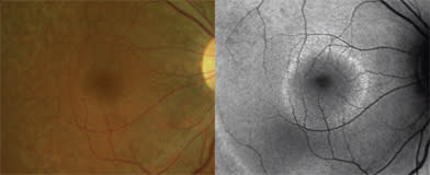 Figure 5. This patient with retinitis pigmentosa shows the typical ring of increased autofluorescence in the parafovea, which is not visible on fundus photography. Functional testing reveals that this ring correlates with functional abnormalities and represent a demarcation line between normal and abnormal functional retina.