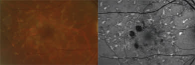 Figure 2. In Stargardt macular dystrophy, fundus pathology is better detected with fundus autofluorescence imaging than fundus photography. Typically, autofluorescence imaging shows a central oval area of reduced signal surrounded by small disseminated spots of reduced and increased intensity. There is also central multifocal RPE atrophy present showing very decreased FAF intensity. Yellowish-appearing flecks on fundus photography correspond to punctate spots with bright autofluorescence signal.