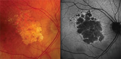 Figure 3. In atrophic AMD, atrophy areas appear as sharply demarcated areas with depigmentation and enhanced visualization of deep choroidal vessels on fundus photograph (left). At the corresponding fundus autofluorescence image (right), atrophic patches are clearly delineated by decreased intensity and high-contrast to non-atrophic retina. Surrounding atrophy, in the junctional zone of atrophy, levels of marked FAF intensity are observed which are invisible on fundus photography. These abnormalities tend to precede atrophy over time and may serve as disease markers.