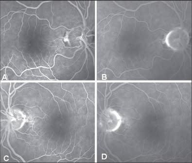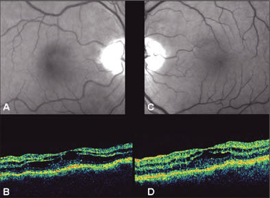 Figure 3. FA images of the (A) mid right eye and (C) left eye and late frames (B) right eye and (D) left eye showing slight hyperfluorescence in the fovea despite marked CME and decreased visual acuity to 20/40.
