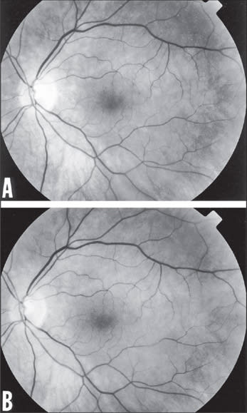 Figure 8. Photograph of the left fundus (A) demonstrating multiple yellow-white punctuate lesions most apparent in the midperiphery and posterior pole with normal macula, optic disk, and retinal vessel architecture. Photograph of the same left fundus (B) showing decreased number of yellow-white lesions after 2 months following treatment with vitamin A.