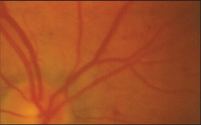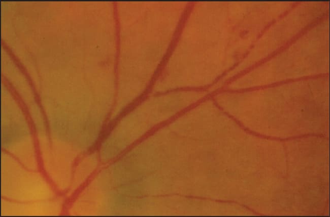Figure 1. Vasospasm in the retina of a similar patient during an attack of transient monocular visual loss, showing constriction of retinal arterioles and veins, rouleaux formation in the veins typical of low flow.