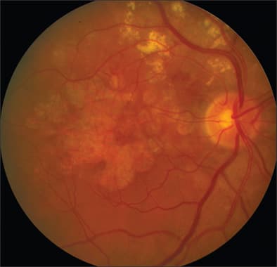 Figure 3A. Color image reveals hemorrhaging and hard exudates along superior arcade extending in the macula in a patient with polypoidal choroidal vasculopathy.