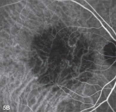 Polypoidal choroidal vasculopathy presents with multiple recurrent serosanguinous detachments of the RPE and neurosensory retina secondary to leakage and bleeding from choroidal vascular lesions (Figure 3A). Yanuzzi and associates describe the characteristic ICG angiographic findings of polypoidal lesions in the choroidal circulation and branching vascular networks (Figure 3B). ICGA can also show increased vascular permeability of the choroidal vasculature that can be indicative of a poorer prognosis.