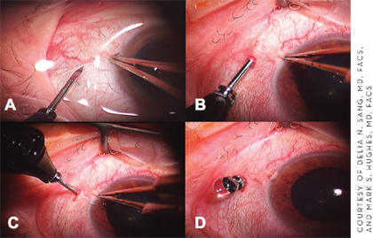 Figure 1. (A-D) Insertion of 23-gauge trocars and microcannulas. The microcannulas are inserted through the conjunctiva into the eye by means of a trocar. Insertion is accomplished by first displacing the conjunctiva laterally by approximately 2 mm. An initial oblique, then a perpendicular tunnel is made parallel to the limbus through the conjunctiva and sclera, thus, creating a self-sealing wound.