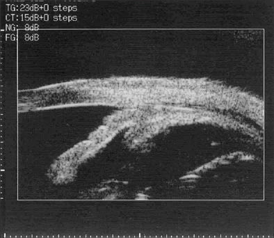 | Figure 6. Ultrasound images showing detachment of ciliary body (left) and choroid (right) due to ocular hypotension. | |