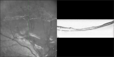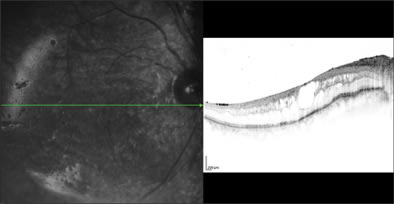 Figure 5. Spectralis OCT imaging on postop day 2. A polycystoid macular edema, with preserved retinal architecture was seen (above), while a (representative) scan at the superotemporal vascular arcade revealed an thinned, atrophic retina (below). Left fundus images are taken in infrared modus, whereby the green arrow corresponds with the direction OCT scans on the right.