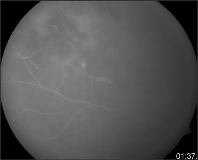 On subsequent dilated funduscopic exam, her vitreous had cellular infiltration, and the peripheral retina showed whitish confluent areas along with perivascular hemorrhages and vascular occlusions (Figure 2). Detailed evaluation of her central fundus and optic disc were compromised by haze in the optic media yet appeared normal. Fluorescein angiography showed areas of perivascular leakage and vascular nonperfusion in the periphery (Figure 3).