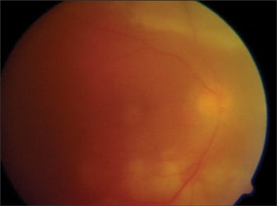 A 59-year-old female presented with visual loss due to a "dark spot" for 2 weeks in her right eye. She had no prior history of ocular complaints. She denied any recent history of flu-like illness or other obvious signs of disease. Her medical history was significant for mammary carcinoma, which had been treated with 3 cycles of chemotherapy in 1996. Her uncorrected vision was 20/200 in her right eye and 20/25 in her left eye. Intraocular pressure (IOP) in her right eye was 13 mm Hg.