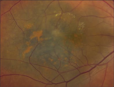 Figure 1. Juxtapapillary/macular uveal melanoma after treatment with iodine 125 brachytherapy. Notice early radiation changes in the form of hard exudates overlying the tumor. Tumors such as this were excluded from the COMS.