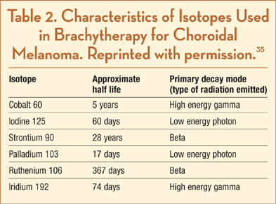Iodine 125 for choroidal melanoma was first described by Sealy in 1976.13 The major advantages of this design over the previously described technique with cobalt 60 were the ability to protect the surrounding ocular structures, including the eyelids and lacrimal system, and the decrease in radiation exposure to the surgical staff.14 The isotope was chosen for the COMS trials because of its availability in the United States in a wide range of seed strengths and relative safety due to ease of shielding.15,16 It also has a favorable half-life, allowing multiple uses prior to disposal.17