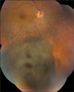 | Figure 3a. A medium-sized melanoma as classified by the COMS criteria prior to treatment. | Figure 3b. Lesion in 3A at 6 months after brachytherapy. Note the early radiation retinopathy. |