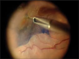 By injecting MembraneBlue in an air-filled vitreous cavity, the intraocular membranes are stained without diluting the dye, he says.