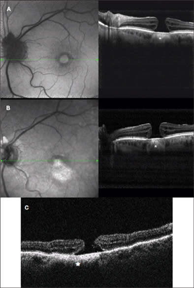 In both cases, atrophy of the retina, as identified on OCT, explains the better visualization of subretinal structures. In particular, choroidal vessels are evident and their limits are sharper than under normal retina areas; even sclera could be visualized under choroidal vessels. Note that, along the scan line, there is an area of hypertrophic RPE area corresponding in retinal imaging to 1 of the residual autofluorescent zones surrounded by atrophy. In Figure 4, a comparison is shown between SD-OCT (top panel) and TD-OCT (bottom panel) images of the right eye. Best-corrected VA in this eye was 20/32 because of a relatively conserved neuroretina in the foveal region. The retina is diffusely thinned so that choroid and choriocapillaris are visible. Note the high backscattering (*) in correspondence of an atrophy area: In SD-OCT imaging, choroidal vessels are more distinguishable than in TD-OCT images.