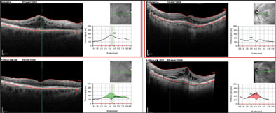 During examination with Spectralis, the operator could view the OCT and retinal images at the same time and he could position the OCT scanning line by moving it to interesting areas visualized in SLO images (SLO images could be either infrared reflectance image, red-free image, fluorescein or indocyanine green angiography [ICGA] image, or a fundus autofluorescence image).