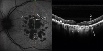 Figure 3. Confluent and multiple retinal atrophic areas simultaneously examined by AF and SD-OCT (left eye). In the AF image, there is absence of autofluorescence in correspondence to RPE atrophy, due to the lack of lipofuscin. In the SD-OCT image, subretinal structures under atrophy are more visible for higher passage of reflectance, and it is possible to visualize the sclera (*). Note the differences in the RPE and photoreceptors layers between the normal retina (2) and atrophy areas (1 and 3). In the white circle, a hypertrophic RPE area can be seen.