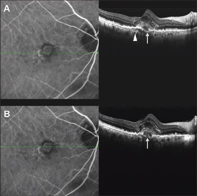 Figure 2. Subfoveal choroidal neovascularization, analyzed with SD-OCT and simultaneous ICGA. Internal structure of the CNV and photoreceptor alteration are visible in SD-OCT images. BM is definite and continuous as a hyperreflective band separating from RPE (arrow head). Choroidal vessels are sharp and identifiable. Very little translation of scanning position between top panel and bottom panel reveals the presence of RPE disruption (white arrow).