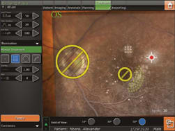 The surgeon first captures retinal images and fluorescein angiography results, then uses a computer interface to mark areas to treat — and those not to treat, such as near the fovea and optic nerve. The plan is then displayed over top of the live fundus image to provide a roadmap for the surgeon to follow. Manufacturer OD-OS, located in Teltow, Germany, summarizes this process as "image, plan, treat" and the concept itself as "retina navigation."