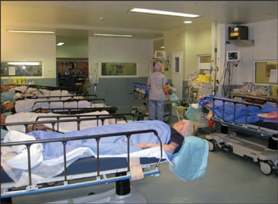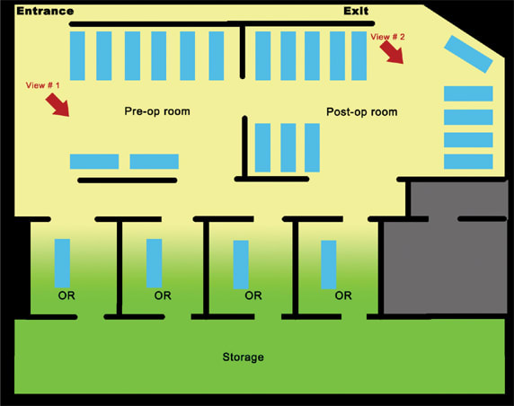 Operating Theater Arrangement. To avoid any circuit congestion, our operating theater differs from most others. In having 2 very large areas of both pre- and postop anesthesia, we are able to admit 20 patients at the same time. The preoperating room is equipped with 8 anesthesia-equipped stations (2 patients in preparation for each OR); the postsurgery room is equipped with 12 (3 patients per OR) (Figures 2 and 3).