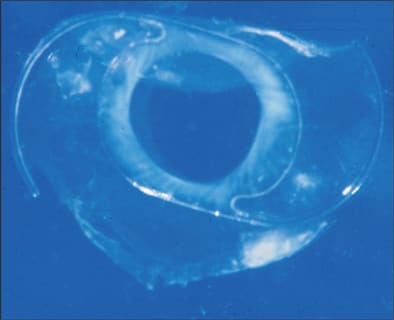 Figure 6. Gross photograph of a one-piece polymethyl methacrylate posterior chamber intraocular lens completely surrounded by an intact capsular bag with a small amount of iris pigment on the anterior surface. |