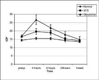 Figure 1. Intraocular pressure in normal, pseudoexfoliation syndrome (XFS) and glaucomatous eyes with no prophylactic hypotensive treatment after cataract surgery.