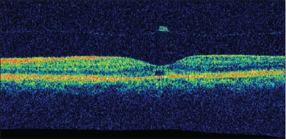 Figure 3. Stratus OCT of the left eye at the time of the scheduled surgery, demonstrating complete PVD with closure of the macular hole, restoration of an almost normal foveal contour, a small subretinal cyst, photoreceptor discontinuity, and an operculum attached to the detached vitreous.