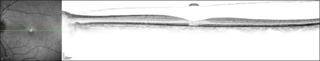 Three months later, there was no change in metamorphopsia in the left eye and visual acuity was stable at 20/200, but upon examination, it seemed that the hole was closed. Stratus OCT demonstrated complete PVD with closure of the macular hole in the left eye. Foveal contour returned to an almost normal configuration, and a small subretinal cyst, photoreceptor discontinuity, and an operculum attached to the detached vitreous are all that remained of the once full-thickness macular hole (Figure 3). Over five months of follow-up, visual acuity of the left eye improved to 20/50, and Spectralis HR-OCT demonstrated almost complete absorption of the cyst and restoration of the normal foveal contour. Only a subtle discontinuity of the photoreceptor layer was still noticeable — a fact that may explain the still decreased visual acuity (Figure 4). The right eye remained unchanged during this period.