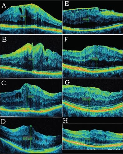 Figure 3. Spectral-domain OCT follow-up after pars plana vitrectomy with trypan blue staining and ILM peeling for ERM. A. Preoperative view of a patient with epiretinal membranes. Fovea contour is elevated. A hyper-reflective structure on the inner surface of the retina, representing an epiretinal membrane, is visible. Cystoid spaces near to the fovea are present. B. One week postoperatively. Epiretinal membrane is removed. The fovea is still elevated. Central retinal thickness is 779 μm. Cystoid spaces are present. C. Three months postoperatively. D. Twelve months postoperatively. No recurrence of epiretinal membranes is visible. The fovea flattened slightly, but central retinal thickness is still increased (557 μm). E. Preoperative view of another patient with epiretinal membranes. F. One week postoperatively. G. Three months postoperatively. H. Twelve months postoperatively.