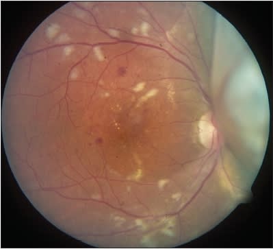 Following plaque brachytherapy for choroidal melanoma, radiation retinopathy involving the macula has been reported to occur in 10% to 63% of eyes.4-11 Higher rates were associated with larger tumors and/or increased radiation dosages. In a recent Collaborative Ocular Melanoma Study publication, evidence of radiation retinopathy was seen in 90.7% of eyes eight years after iodine 125 brachytherapy for choroidal melanoma (Figure 2).12