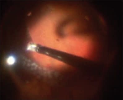 In eyes that are pseudophakic with questionable capsular or zonular integrity or eyes that are aphakic, an inferior iridectomy large enough to stay open postoperatively usually prevents migration of silicone oil into the anterior chamber postoperatively (Figure 2).10 If oil migrates into the anterior chamber during surgery, the oil will sometimes exit the anterior chamber if the surgeon injects viscoelastic into the anterior chamber, removes oil from the posterior chamber, or completely removes the oil from the eye. Ocucoat (Bausch & Lomb) can be left in place; removal causes oil to come forward.