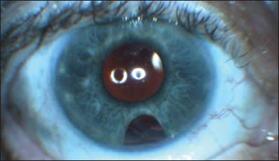 Figure 2. Image showing generous inferior peripheral iridectomy. This patient recovered 20/30 visual acuity after several retinal reattachment surgeries for retinal detachment and proliferative vitreoretinopathy. His silicone oil has been removed. Subtle droplets of silicone oil can be seen on the intraocular lens.