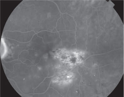 Figure 3. Late-phase fluorescein angiogram at higher magnification displaying the extension of the clinically significant macular edema.