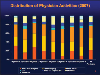 Dr. Dugel and his associates looked at each service provided, the place it was provided, how much time was spent, and several other variables in conducting their ABC analysis. For instance, one variable Dr. Dugel examined was contribution margin. He found that for every dollar that came into his practice, 40 cents came from doing vitrectomies, 51 cents came from laser photocoagulation, and 16 cents came from intravitreal injections. “But almost everything else,” Dr. Dugel noted, “lost me money — including office visits, OCTs, and and fluorescein angiograms.”