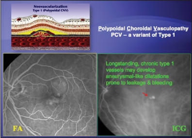 Finally, he discussed a variant of type 1 lesions, polypoidal choroidal vasculopathy (PCV) (Figure 6). Dr. Freund said these lesions are important particularly because they sometimes do not respond well to anti-VEGF therapy. He detailed a case of PCV, noting that increasing lipid exudation while on anti-VEGF treatment was often an indicator of PCV.