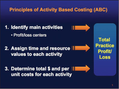 ABC, he explained, is a three-step process: (1) Identify the main activities as separate profit-loss centers; (2) Assign time and resource value to each of these activities; and (3) Determine the total dollars per unit cost of each activity (Figure 7). Dr. Dugel presented data from an ABC analysis conducted at his own practice, Retinal Consultants of Arizona in Phoenix, where he is managing partner.