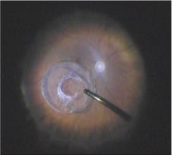 Figure 1. Intraoperative appearance of luxated capsular bag-intraocular lens-capsular tension ring complex.
