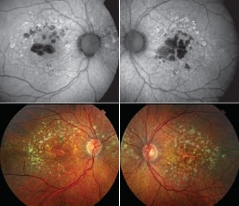 A color fundus photograph and an autofluorescence image depict a patient who has age-related macular degeneration. The latter was captured through the new optimized Spaide Autofluorescence Filters.
