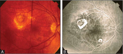 The patient was followed up at regular intervals. He was prescribed an oral vitamin A supplement, but he failed to keep taking it. In late 2002, he developed sudden decrease in central vision in his left eye and was noted to have an extrafoveal CNV, which progressed subfoveally to a disciform scar despite PDT treatment (Figure 2). The final vision in the left eye was counting fingers (CF).
