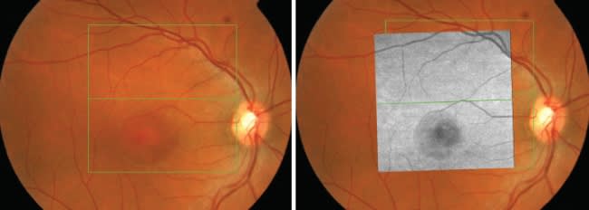 Figures 2 and 3. One benefit derived from the data acquisition speed of spectral domain OCT is the ability to register scans with a fundus image, which improves the precision of patient monitoring from visit to visit.