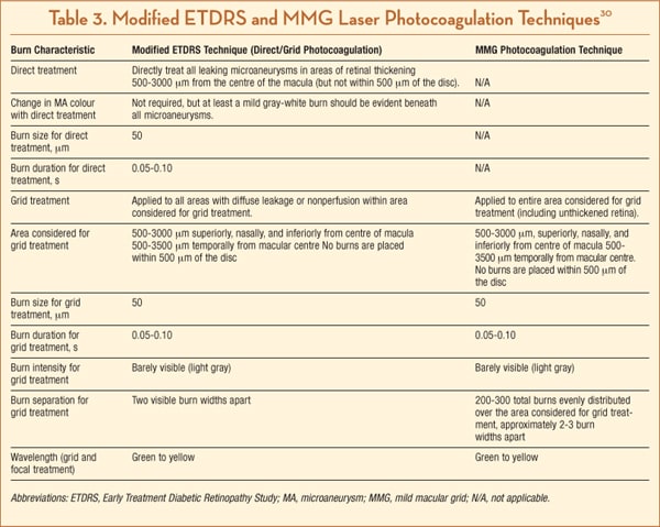 The Diabetic Retinopathy Study (DRS) and Early Treatment of Diabetic Retinopathy Study (ETDRS) have demonstrated the efficacy of laser treatment in DR. A more recent study compared two laser photocoagulation techniques for the treatment of diabetic macular edema: the modified ETDRS direct/grid photocoagulation technique and a potentially milder (but potentially more extensive) Mild Macular Grid (MMG). At 12 months after treatment, the MMG technique was less effective at reducing retinal thickening, as measured with optical coherence tomography, than the ETDRS laser photocoagulation approach. However, the visual acuity outcome with both approaches is not substantially different.30