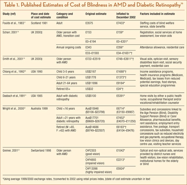 The cost to the state of a person with permanent vision loss will vary according to many factors, including the age of the person, the provisions the state provides for a blind person, and also what is used as the definition of blindness. A commonly applied definition of blindness is 20/200 or worse in the better-seeing eye. Table 1 summarizes data available from various studies estimating the cost of vision loss from age-related macular degeneration and DR.16