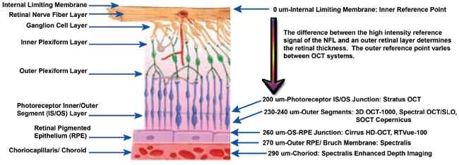Figure 8. Graphical representation of the reference boundaries for seven different OCT systems: Stratus OCT 3000, Cirrus HD-OCT, Spectralis, 3D OCT-1000, RTVue-100, Spectral OCT/SLO and SOCT Copernicus HR. All systems' inner reference boundary is at the internal limiting membrane, but each varies in the outer reference boundary.