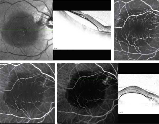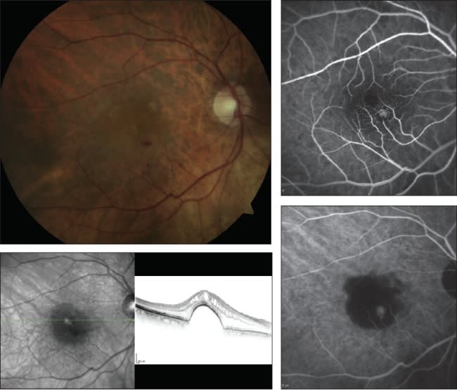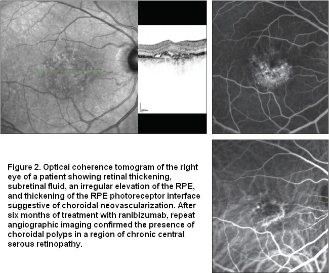Figure 2 is an example of the common clinical disorder central serous retinopathy. At the initial assessment of the patient, optical coherence tomography showed the presence of retinal thickening, subretinal fluid and focal pigment epithelial detachments. A diagnosis of occult choroidal neovascularization was made and the patient treated with intravitreal ranibizumab. When no therapeutic response was noted on completion of the loading phase, a reassessment of the fluorescein and ICG angiography revealed the absence of neovascular complexes. Instead, the presence of dilated and leaking choroidal vessels indicated that the observed features were more consistent with a diagnosis of chronic CSR complicated by idiopathic polypoidal choroidopathy.5 While there is an argument for treating exudative macular conditions other than neovascular AMD also with anti-VEGF therapy, studies involving robust comparisons between the currently available standard of care for these other conditions and anti-VEGF therapies have not yet been undertaken. Therefore, the administration of invasive treatments with potential for adverse effects should not be carried out without careful documentation and knowledge of the underlying disease condition.