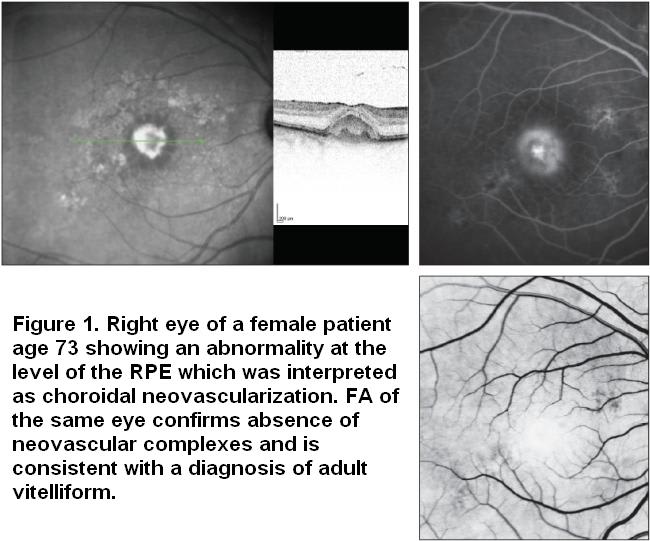 A comprehensive list of AMD mimickers is outside the scope of this article. However, conditions such as central serous retinopathy, perifoveal macular telangiectasia, minor branch retinal vein occlusions in the vicinity of the macula, diabetic retinal macular edema and adult vitelliform lesions are a few examples of entities that can share common tomographic features with exudative AMD. The OCT in Figure 1 from a 70-year-old female patient shows a subfoveally-located macular lesion with associated retinal thickening, an appearance consistent with choroidal neovascularization. The accompanying fluorescein angiogram confirms the presence of an adult vitelliform lesion.