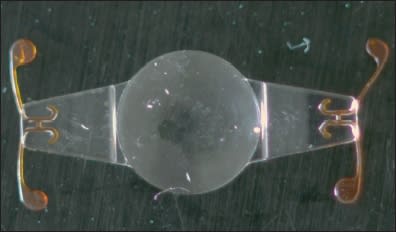 Figure 2. Crystalens IOL after explantation. The capsular bag was also removed, divided into two portions, and sent to microbiology and pathology for analysis.