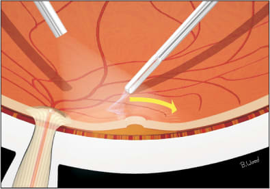 Many retinal surgeons use a lateral motion of the extrusion cannula, soft-tip cannula or vitreous cutter to create a PVD. This method creates shear force at the vitreous base, potentially leading to iatrogenic retinal breaks. A better method is to position the vitreous cutter at the nasal, superior, and inferior margins disk margins, with the port oriented away from the center of the disk, and to pull anteriorly (toward the cornea), using the vacuum-only mode (Figure 1). The anterior-pull disk-margin method safely, reliably and quickly produces a PVD using 25-g cutters. It is a huge misconception that higher flow rates help produce PVDs or that 25-g cutters cannot produce a PVD; it is all about technique.