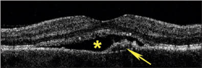 Figure 2. Acute CSR showing PED with discontinuous RPE (arrow), possibly indicating areas of RPE leakage, with overlying exudative neurosensory retinal detachment (asterisk).