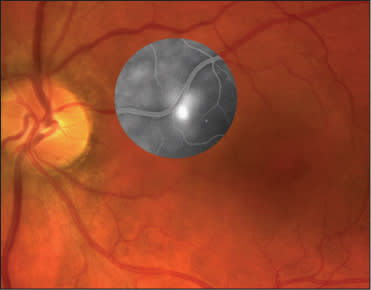Figure 5. RPE leak temporal to disc (FA overlay) with CSR RD extending into fovea.