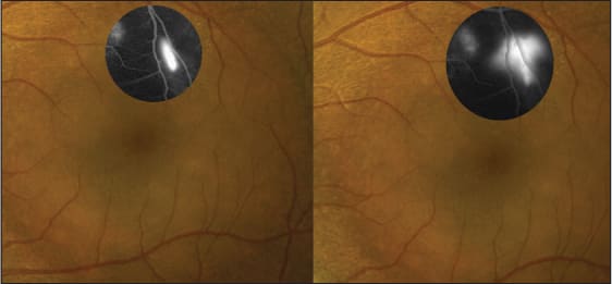 Figure 3. Early (left) and late (right) images of acute CSR demonstrating a classic “smoke-stack” RPE leak of the FA image insert on top of a photo showing the exudative RD.
